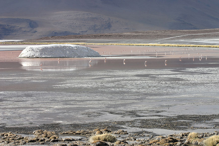 Flamants roses et dépôts de gypse/borax sur la Laguna Colorada (4278m) | EOS 300D | EF 70-200mm (78mm) 1/500e | f/9 | iso-200 |