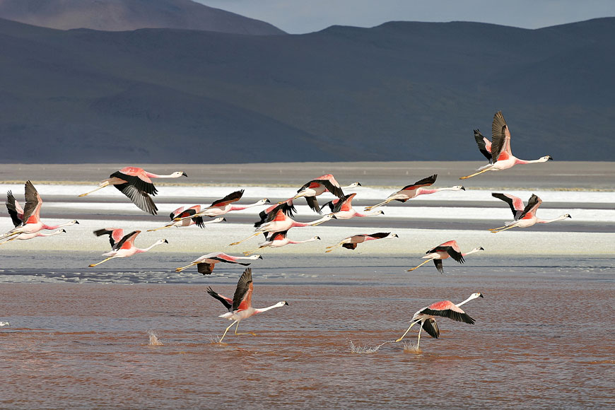 Envol de flamants roses sur la Laguna Colorada (4278m)