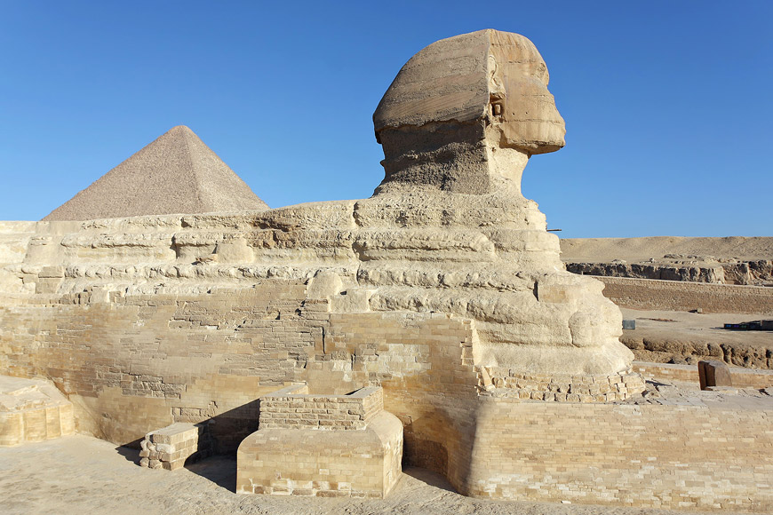 Plateau de Gizeh - Le Sphinx, au fond la pyramide de Khéops