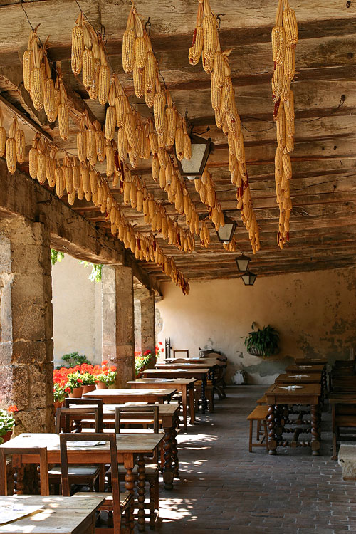 Terrasse couverte d'une auberge sur la place du Tilleul - Pérouges