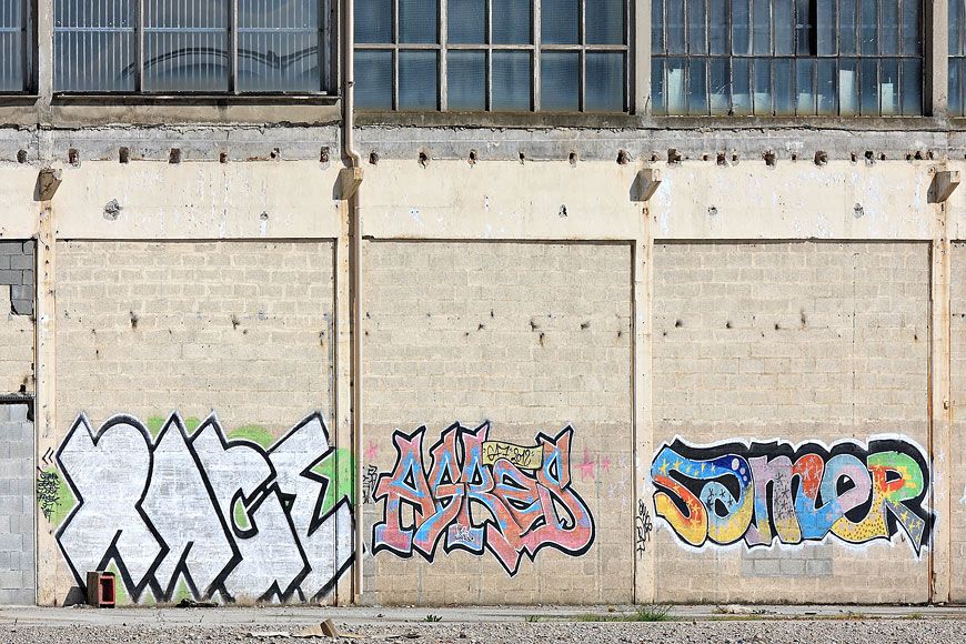Graffs sur une façade de l'ancienne usine TASE en cours de démolition Vaulx-en-Velin / La Soie | EOS 40D | EF 700-200mm IS (121mm) 1/500e | f/8 | iso-100 |