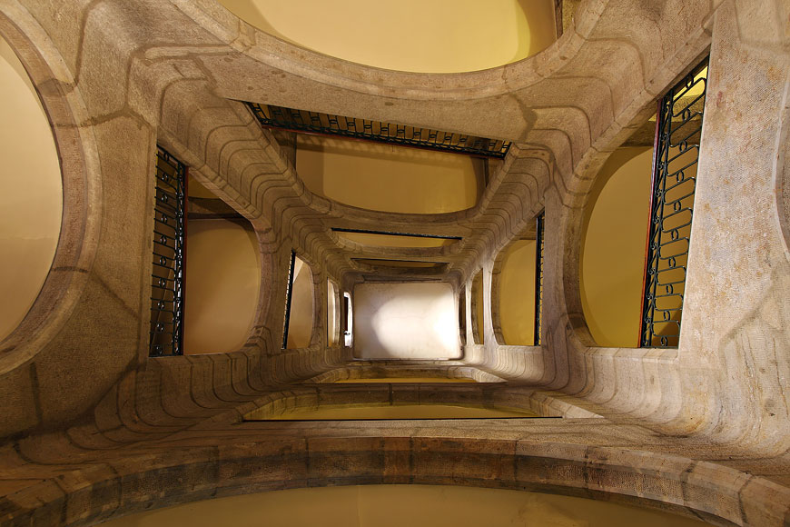 Contreplongée sur l'escalier à quatre noyaux incurvés du n°5 place du Petit-Collège - Vieux-Lyon | EOS 40D | EF-S 10-22mm (14mm) 3s | f/8 | iso-100 |