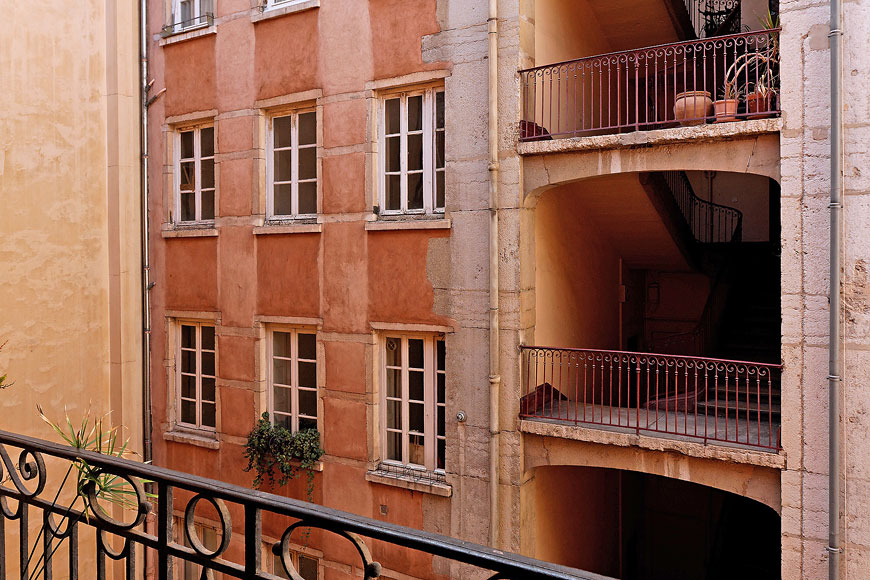 Façade et cage d'escalier d'un immeuble canut - Rue Leynaud, les Pentes | EOS 40D | EF 17-40mm (17mm) 1/160e | f/8 | iso-200 |