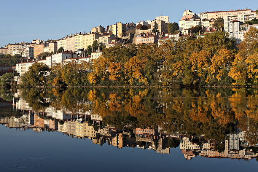 Les immeubles des Pentes de la Croix-Rousse se reflètent parfaitement dans le Rhône | EOS 40D | EF 17-40mm (29mm) 1/200e | f/8 | iso-100 |