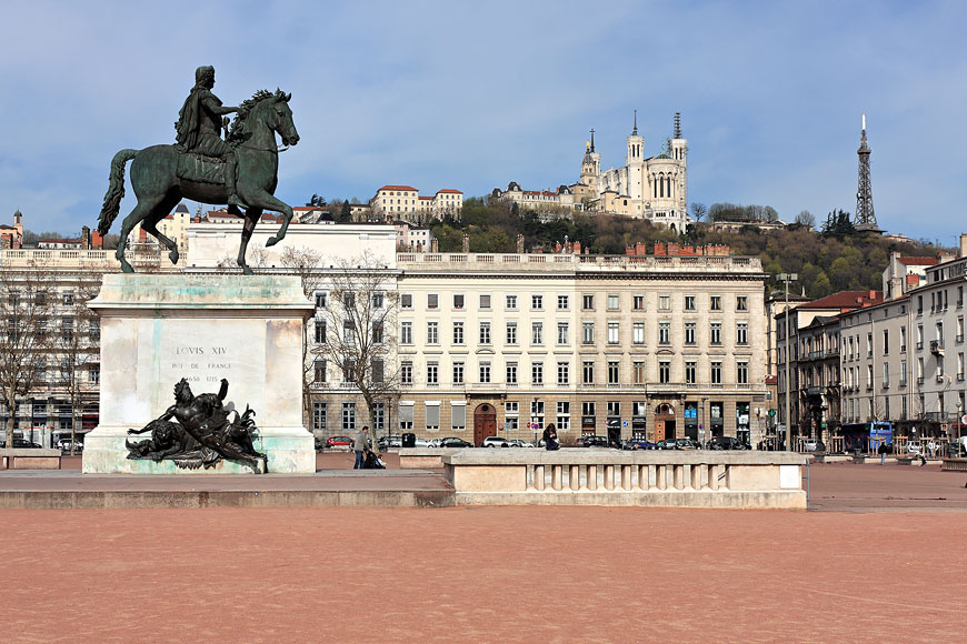 La statue de Louis XIV sur la place Bellecour; au fond la colline et la basilique de Fourvière | EOS 40D | EF 17-40mm (37mm) 1/500e | f/8 | iso-100 |