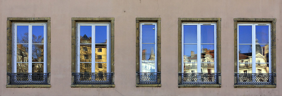 Reflet d'immeubles dans des fenêtres du quai Pierre Scize
