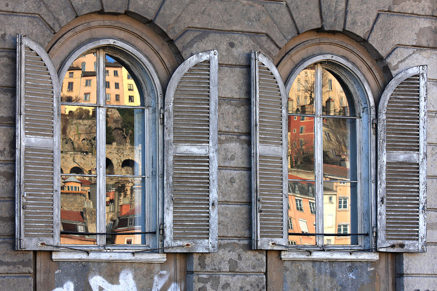 Reflet des immeubles de la colline de Fourvière dans des fenêtres quai Tilsit