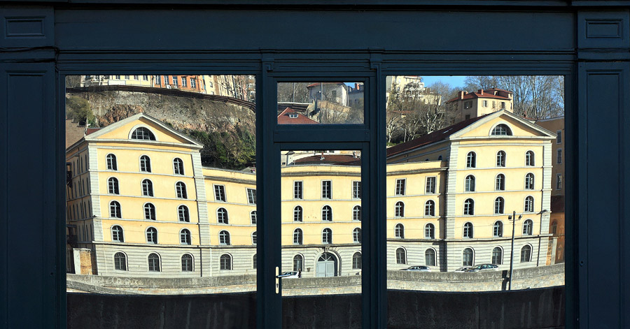 Reflet des Subsistances dans une vitrine quai Pierre Scize