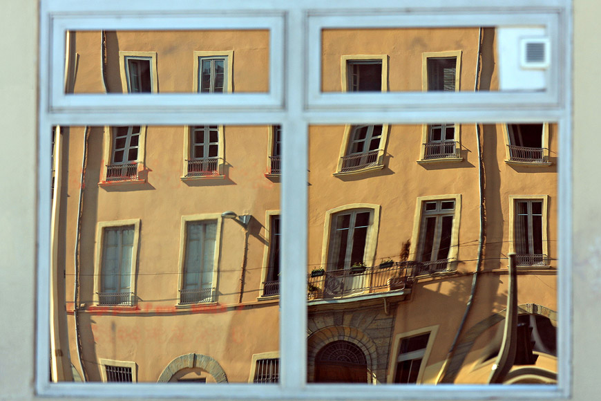 Reflet d'immeubles dans une fenêtre du quai Pierre Scize