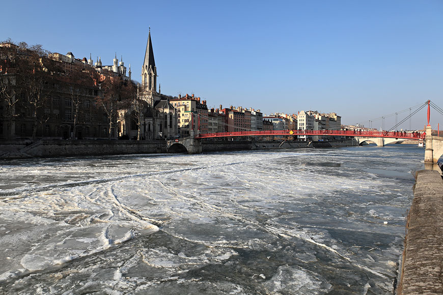 La Saône complètement gelée ; au fond l'église Saint-Georges et la passerelle Paul Couturier | EOS 5D Mk II | EF 24-70mm (25mm) 1/320e | f/8 | iso-100 |