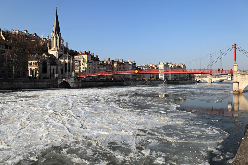 La Saône complètement gelée ; au fond l'église Saint-Georges et la passerelle Paul Couturier | EOS 5D Mk II | EF 24-70mm (25mm) 1/320e | f/8 | iso-100 |