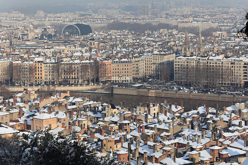 Les toits du Vieux Lyon et de la Presqu'Ile ; on peut voir l'opéra et l'église Saint-Nizier | EOS 5D Mk II | EF 70-200mm IS (100mm) 1/320e | f/8 | iso-100 |