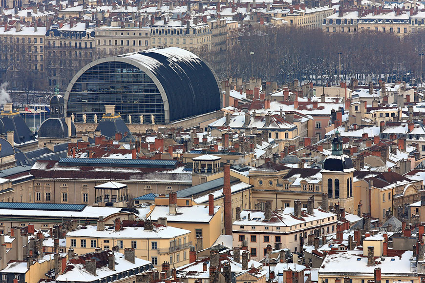 Dôme de l'Opéra de Lyon émergeant des toits de la Presqu'Ile