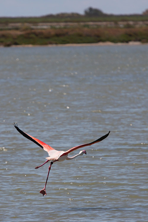 Envol d'un flamant rose sur l'étang de Galabert EOS 40D | EF 70-200mm IS (200mm) + Ext. x1.4 | 1/2000e | f/5.6 | iso-200 |