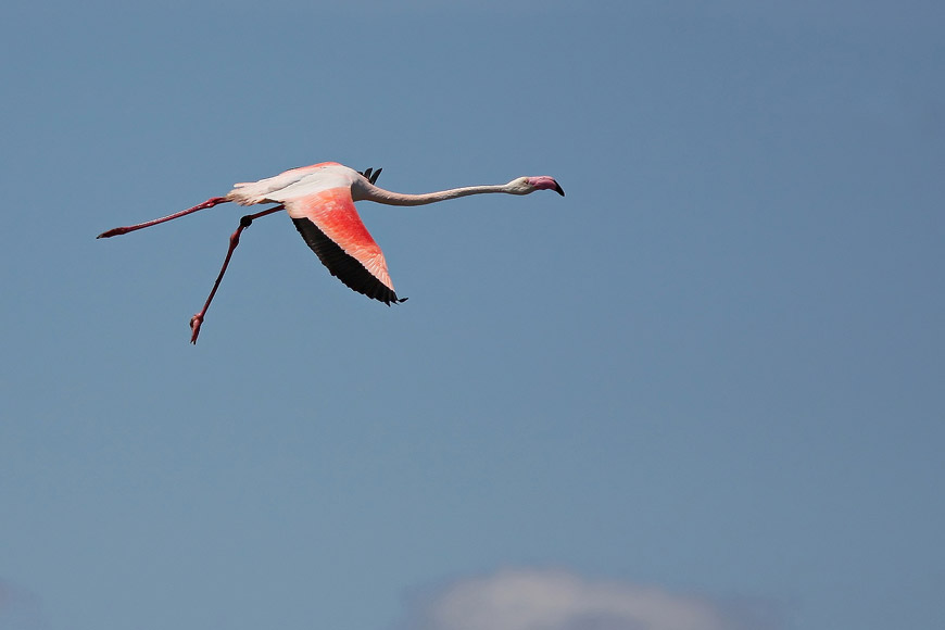 Vol d'un flamant rose au dessus de l'étang de Galabert | EOS 40D | EF 70-200mm IS (200mm) + Extender x1.4 1/3200e | f/5.6 | iso-200 |