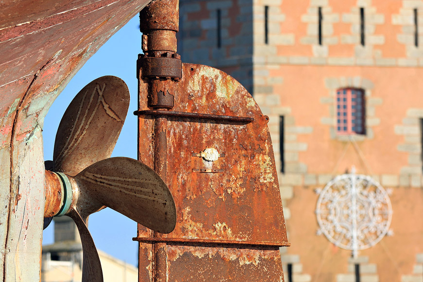 L'hélice d'un vieux bâteau devant la Tour Vauban de Camaret (Kameled) Presqu'Ile de Crozon | EOS 40D | EF 70-200mm IS (116mm) 1/640e | f/4 | iso-100 |
