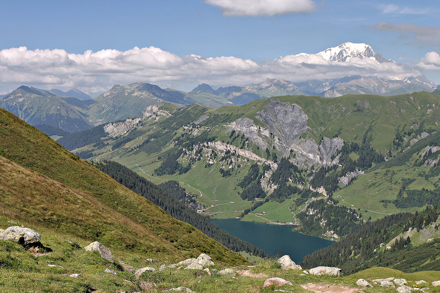 Vue sur le Mont Blanc et le lac de Saint-Guérin en montant vers le col de la Louze | EOS 300D | EF 17-40mm (40mm) 1/200e | f/8 | iso-200 |