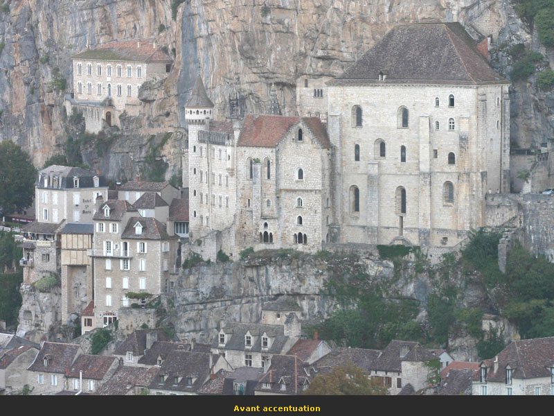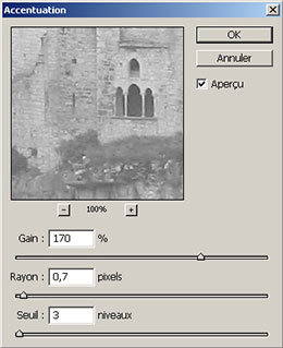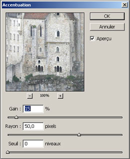 On peut alors utiliser un filtre de type 'masque flou' : menu Filtre\Renforcement\Accentuation. Le gain correspond au pourcentage d'action du filtre. Le rayon détermine les éléments de l'image sur lesquels s'appliqueront le filtre, plus la valeur est élevée et plus l'effet sera visible dans les dégradés et avec un effet de bord prononcé. Le seuil détermine les pixels qui seront accentués en fonction de la différence de ceux avoisinant, l'effet est maximal avec une valeur de 0. J'utilise en général les valeurs suivantes : gain (150 à 200%), rayon (0.3 à 1), seuil (0 à 4). Attention à ne pas abuser de ce filtre au risque d'obtenir des images à l'aspect 'artificiel'. Il faut ensuite repasser l'image en mode RVB (Image\Mode\Couleurs RVB).