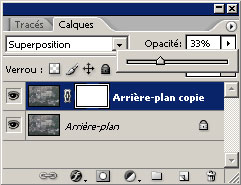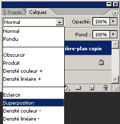 3) Modifiez le mode de fusion (menu déroulant de la fenêtre calques), choisir 'superposition' pour éclaircir l'image (ou 'produit' pour l'assombrir). L'image apparaît alors trop éclaircie, l'étape suivante permet de nuancer le résultat.