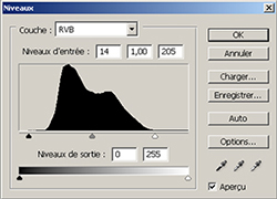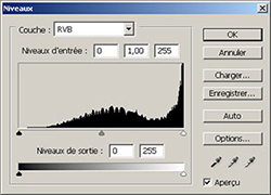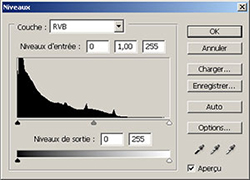 Le réglage des niveaux sert à ajuster l'exposition et le contraste d'une photo par une action directe sur les différentes densités de l'image. La fonction "niveaux" est accessible dans le menu Images\Réglages\Niveaux. L'histogramme de l'image s'affiche alors ; pour ajuster les niveaux, il suffit de déplacer les curseurs situés aux extrémités pour rééquilibrer les tons foncés (curseur noir) et les tons clairs (curseur blanc) + éventuellement le curseur gris (tons moyens).