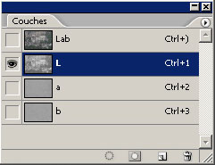 La première étape consiste à passer l'image en mode Lab : Image\Mode\Couleurs Lab. La fenêtre 'Couches' est accessible dans le menu Fenêtres\Couches. Il faut ensuite sélectionner la couche L, l'image passe alors en noir & blanc.