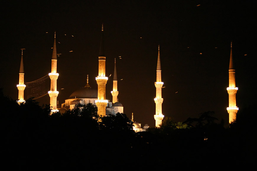 Vue sur les 6 minarets de la Mosquée Bleue de nuit | EOS 300D | EF-S 18-55mm (44mm) 1/5e | f/5 | iso-800 |