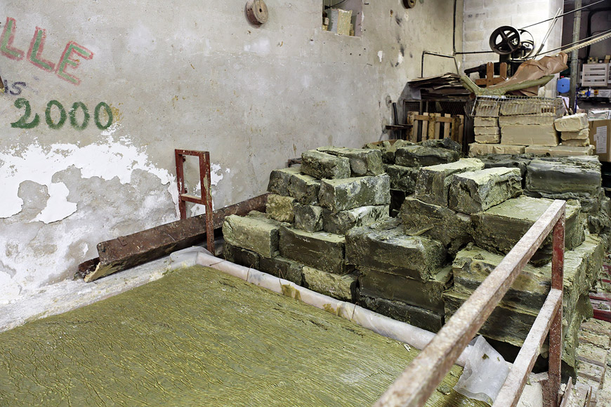 Une 'mise' dans laquelle le savon liquide est versé pour y durcir A droite, blocs de savon bruts - Savonnerie du Sérail | EOS 5D Mk II | EF 24-70mm (24mm) 1/40e | f/3.2 | iso-1600 |