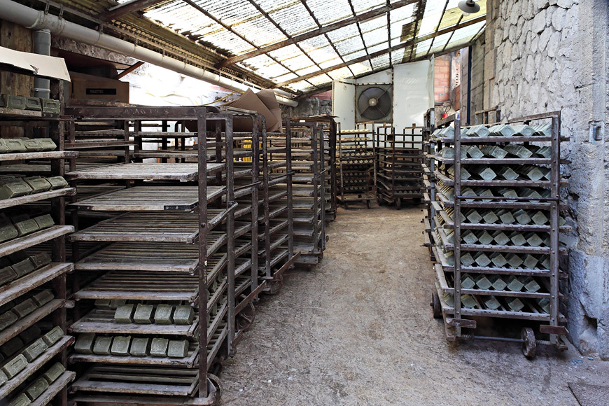 Zone de séchage des cubes de savon déposés sur des clayettes en bois Savonnerie du Sérail | EOS 5D Mk II | EF 24-70mm (25mm) 1/80e | f/6.3 | iso-1600 |