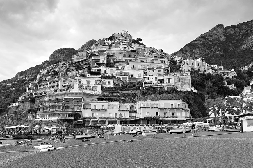 Magnifique empilement des maisons de Positano depuis la Spiaggia Grande Côte amalfitaine | EOS 5D Mk II | EF 24-70mm (24mm) 1/100e | f/8 | iso-100 |