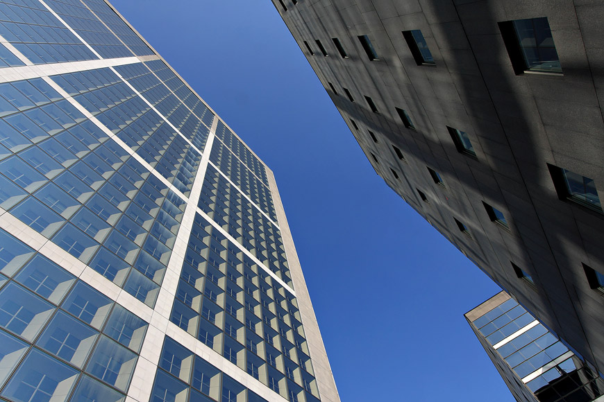 Contreplongée sur une façade de la Grande Arche de la Défense