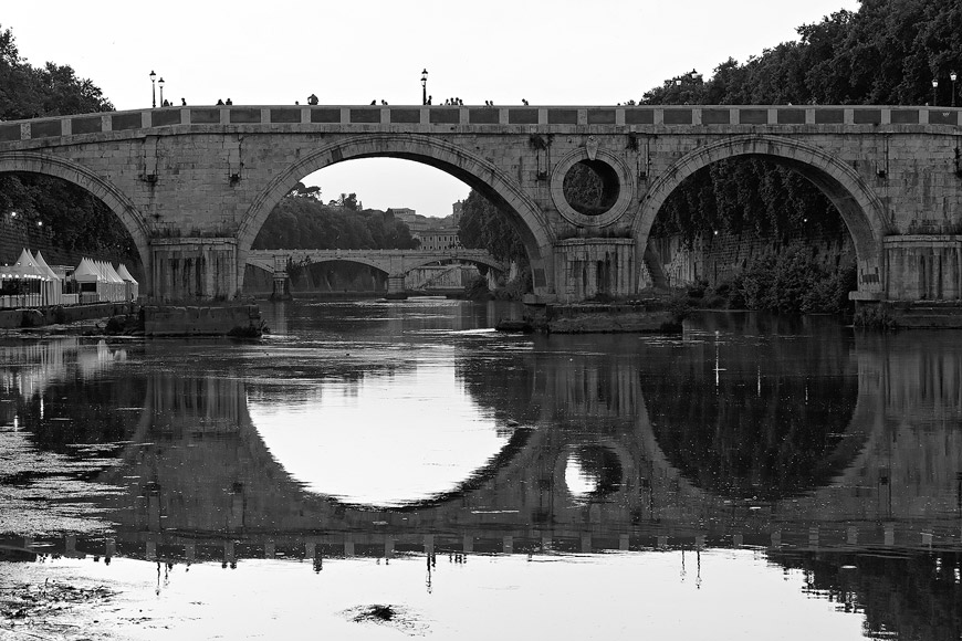 | Le pont Sisto sur le Tibre, au fond le pont Mazzini | EOS 5D Mk II | EF 70-200mm IS (89mm) 1/100e | f/8 | iso-200 |