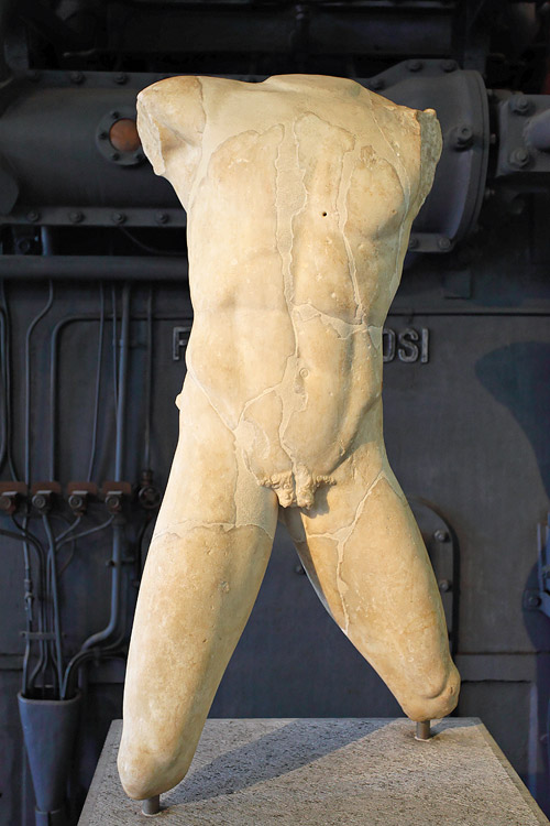 Torse de combattant devant la culasse d’un des moteurs diesel - Centrale Montemartini EOS 5D Mk II | EF 17-40mm (40mm) | 1/80e | f/4.5 | iso-1600 |